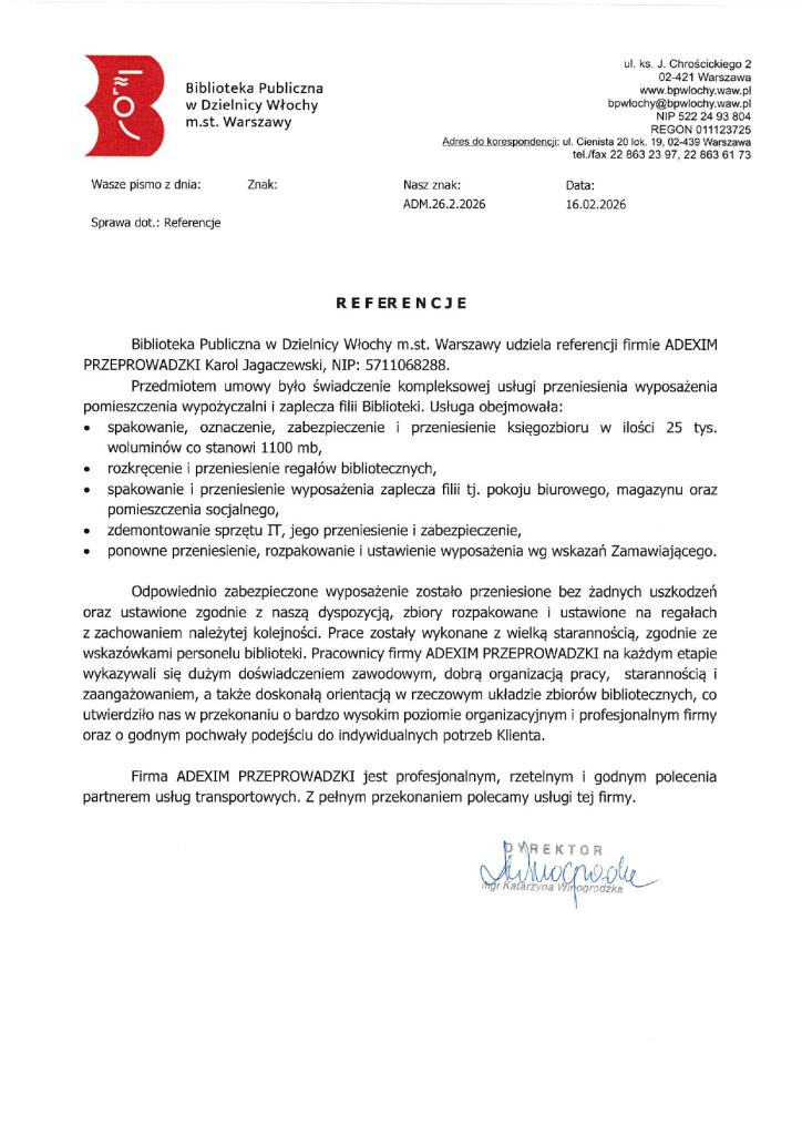 Zadowoleni klienci to nasz niewątpliwy atut. Od 200o roku obsłużyliśmy tysiące zleceń w Polsce i za granicą. Obsługiwaliśmy i dalej obsługujemy największe światowe, europejskie i polskie firmy, instytucja rządowe i pozarządowe, także klientów indywidualnych. Bogate doświadczenie, profesjonalna kadra i nowoczesna flota pozwalają nam realizować przeprowadzki krajowe i międzynarodowe na najwyższym poziomie. Zapraszamy do współpracy.